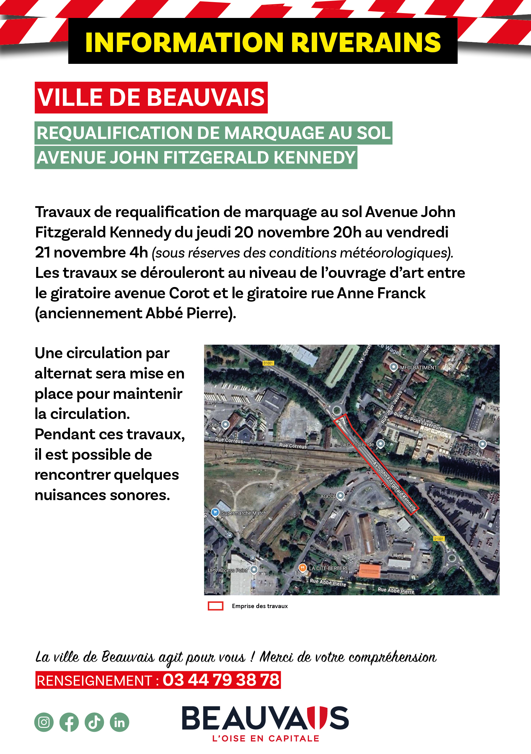 Information riverains : zone de travaux avenue John Fitzgerald Kennedy