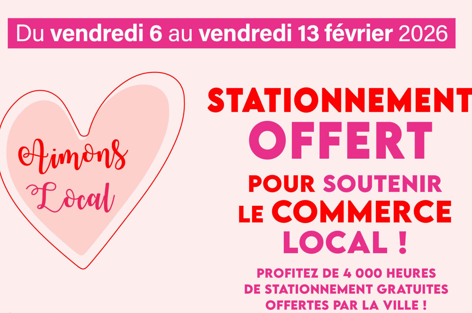 Pour la Saint-Valentin 2026, la Ville de Beauvais lance l’opération « Aimons Local » du 6 au 13 février. Afin de soutenir le dynamisme de nos commerces et d'offrir une expérience shopping sans stress aux amoureux comme aux gourmands, 4 000 heures de stationnement sont offertes aux parkings Foch et Clémenceau. Découvrez comment profiter de vos tickets gratuits dès 20 € d’achat.