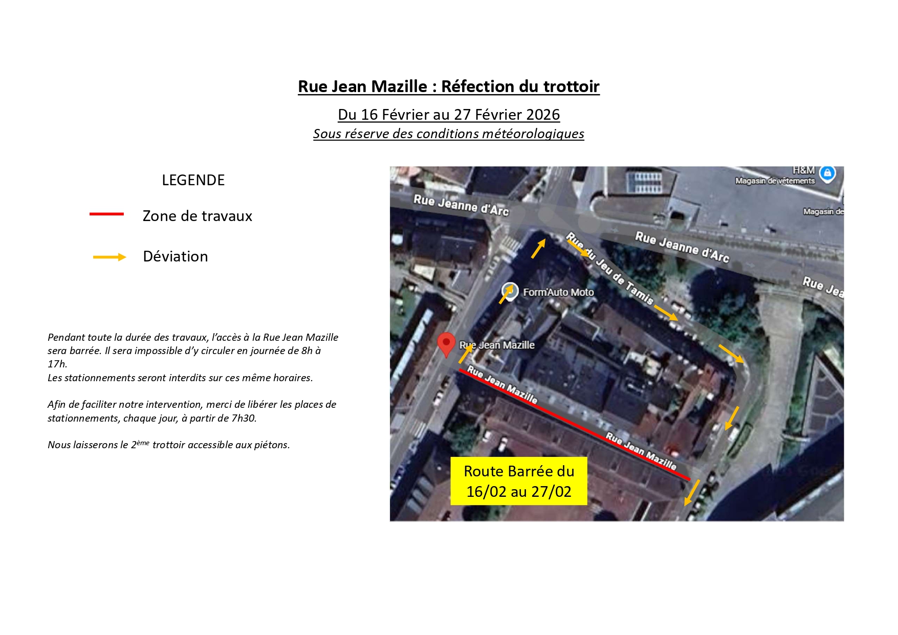 Dans le cadre de l’amélioration du cadre de vie, la Ville de Beauvais engage des travaux de réfection du trottoir rue Jean Mazille du 16 au 27 février 2026. Ces travaux entraîneront des perturbations de circulation pendant toute la durée du chantier.