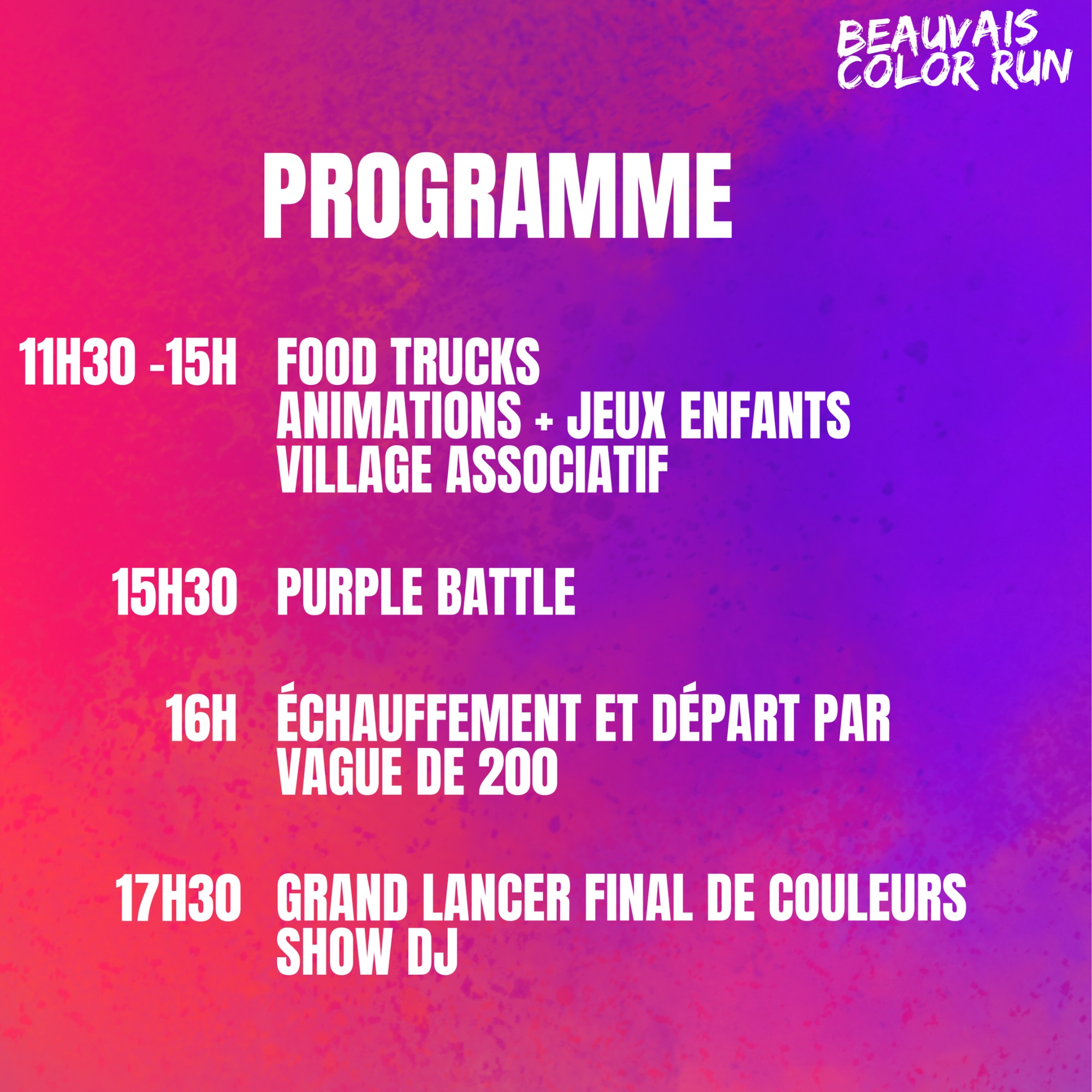 Préparez vos baskets et votre plus beau sourire : la Beauvais Color Run est de retour ! Le dimanche 24 mai 2026, le Plan d’Eau du Canada se transforme en arc-en-ciel géant pour une journée de fête et de partage. Sans chrono et accessible à tous, c'est l'événement idéal pour s'amuser en famille ou entre amis. Ici, seul le plaisir (et la couleur) compte !