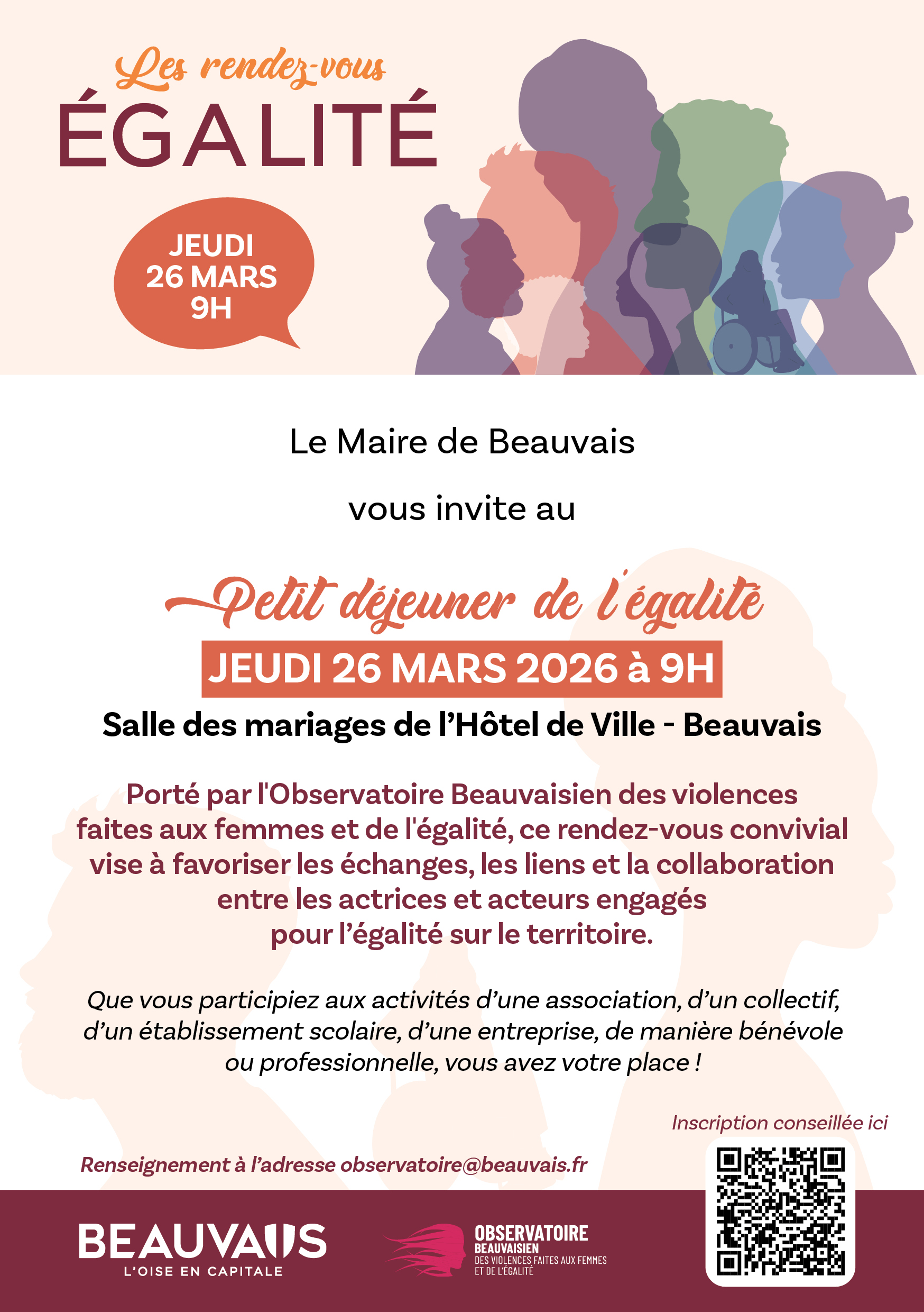Chaque mois, la Ville de Beauvais donne rendez-vous aux forces vives du territoire. Le jeudi 26 mars à 9h, rejoignez le "Petit Déjeuner de l’Égalité" à l’Hôtel de Ville pour renforcer la lutte contre les violences faites aux femmes et bâtir des projets communs.